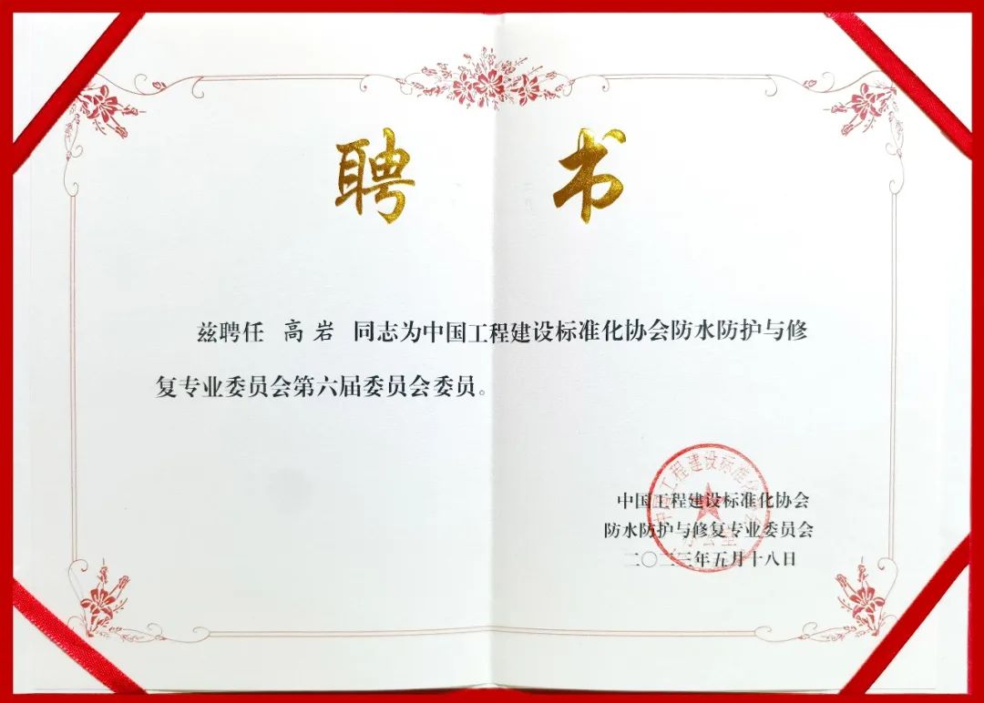 正是企業(yè)自身實(shí)力與自愈合技術(shù)的加持,遼寧九鼎宏泰防水科技有限公司董事長(zhǎng)高巖被聘為中國(guó)工程建設(shè)標(biāo)準(zhǔn)化協(xié)會(huì)防水防護(hù)與修復(fù)專業(yè)委員會(huì)第六屆委員會(huì)委員。